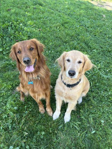 Daisy is about 63 pounds and a beautiful golden color. She enjoys making friends with everyone she meets and would be perfectly content to be snuggled on the coach and being petted all day. She is a low energy dog. Scooby is 60 pounds and is a gorgeous dark red with minimal feathering. He has high drive and high energy and comes from proven field lines, such as Topbrass and Thistle Rock.